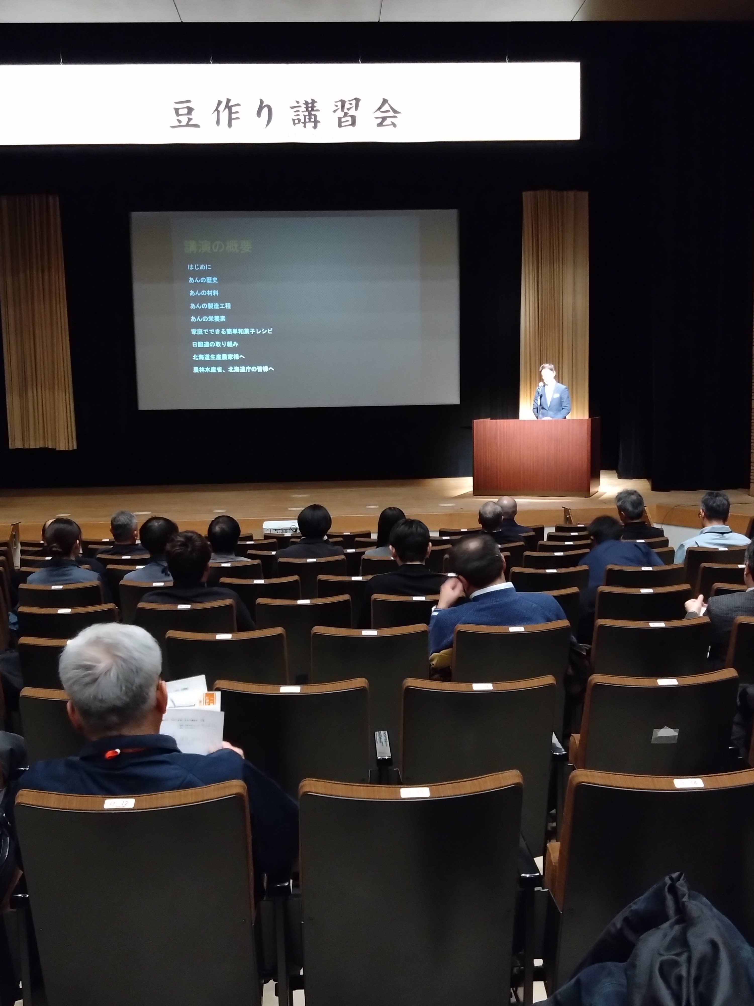 本年は、昨年までと同様に前半と後半に分けて、まず前半として2月12日に当麻町(当麻町公民館)、13日に千歳市(北ガス文化ホール)にて開催しました。それぞれの会場では、道庁農政部の司会進行のもと、主催者を代表して日本豆類協会伊藤参与から御挨拶した後、