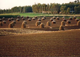 根切り後の乾燥方法は、豆の種類、地域、労働力事情等により様々です。大粒で乾燥しにくい花豆類は、根切りして数日間そのままの状態で予乾した後、支柱から茎をはずしてニオ積み乾燥させる方法か、支柱ごと井桁状に積み上げて乾燥させた後、脱粒作業時に茎を支柱からはずす方法をとることが多いようです。一方、虎豆類や大福類では、手間のかかるニオ積み等を省略し、収穫物を支柱ごと集め、束にして縦置きで乾燥させる方法か、根切り後、ほ場でそのままの状態で乾燥させ、脱粒作業の直前に支柱ごと集める方法をとることが多く、いずれの場合も、支柱はずしは脱粒時に同時並行して行います。
