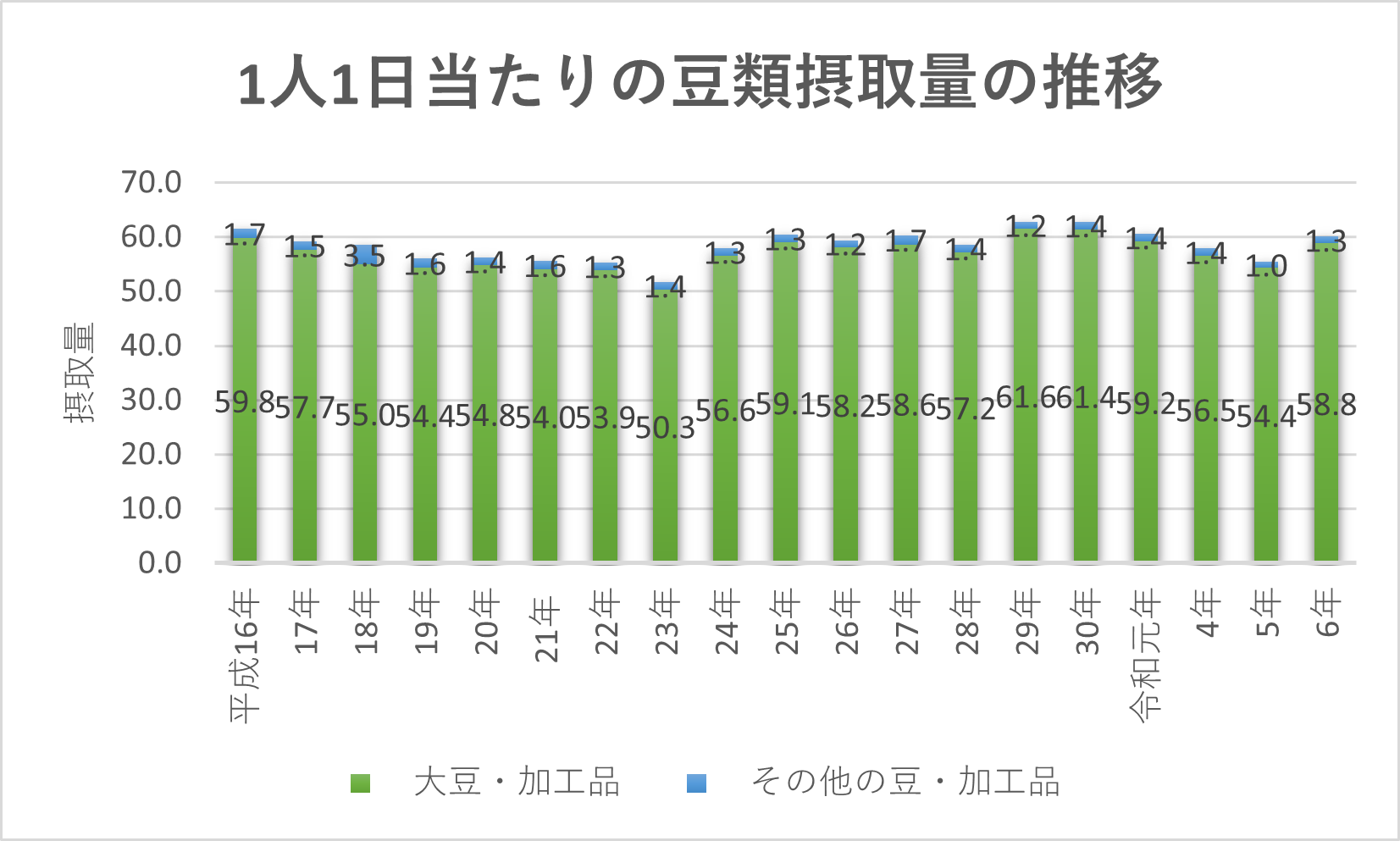 また、豆類の1人1日当たり消費動向を、摂取量という側面からみると、豆・豆加工品(大豆・加工品、その他の豆・加工品)はほぼ50~60グラムで推移しています。このうち、大豆以外の豆・豆加工品は1~2グラム程度で、大宗は大豆とその加工品で占められています。近年の大豆・加工品の摂取量の推移をみてみると、平成29年をピークに減少傾向を示し、令和5年には54.4グラムとなったものの、6年は58.8グラムでした。