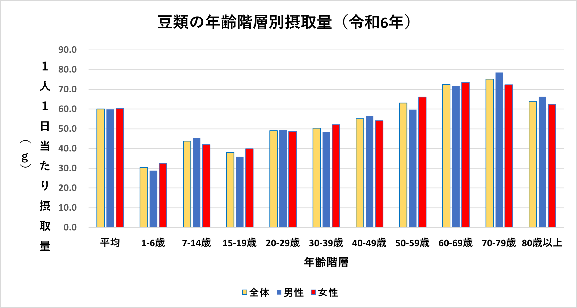 豆類の摂取量を年齢階級別にみると、概ね年齢階級が上がるほど多くなるという傾向が顕著に見られ、70才代の1人1日当たり摂取量(大豆・加工品を含み、菓子類、味噌を含まず。)は、令和6年のデータによりますと全体平均より15グラム程度多い75グラムとなっています。