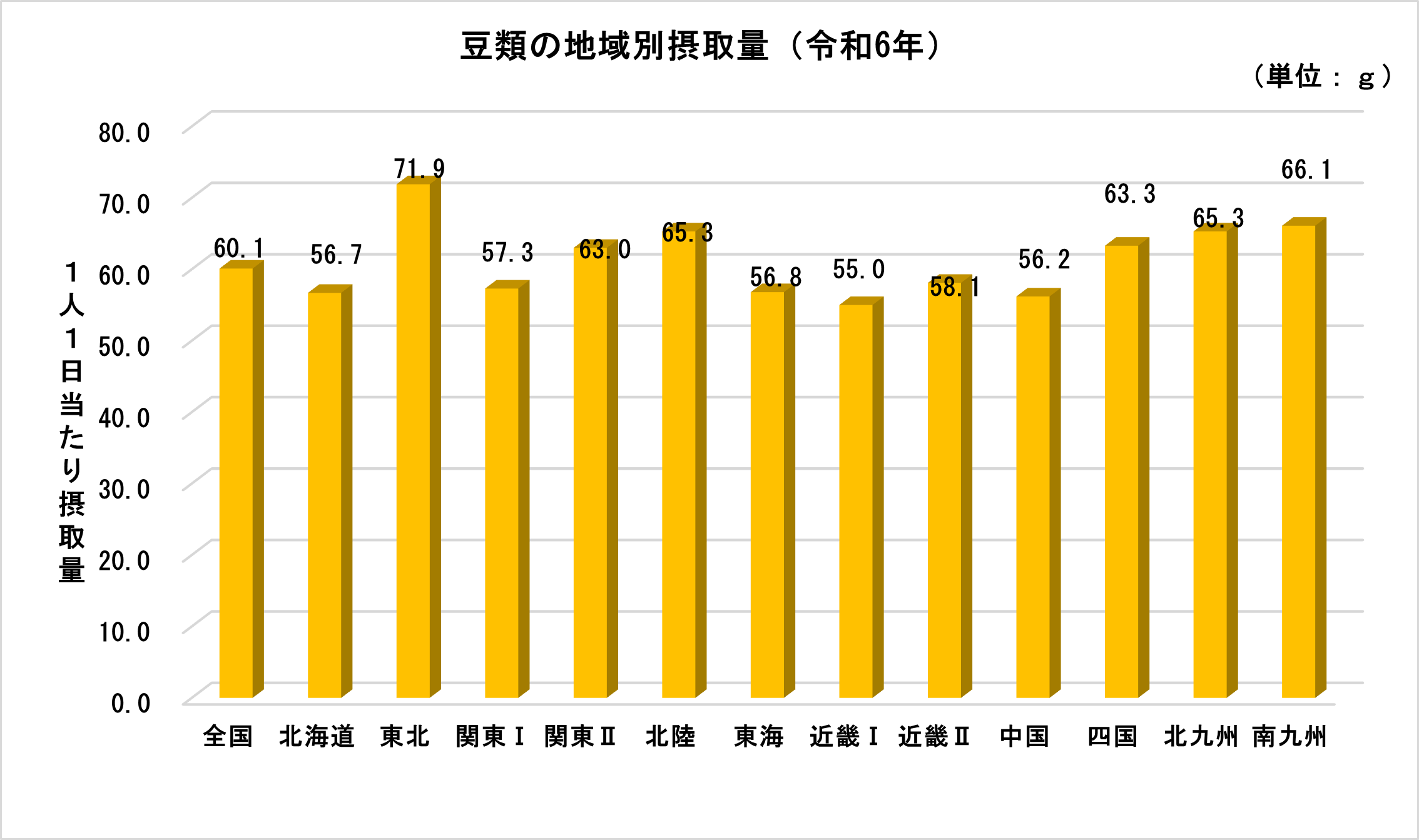 また、地域別にみると、豆類の1人1日当たり摂取量(大豆・加工品を含み、菓子類、味噌を含まず。)は、東北、北陸、北九州地域で多く(65グラム以上)なっています。