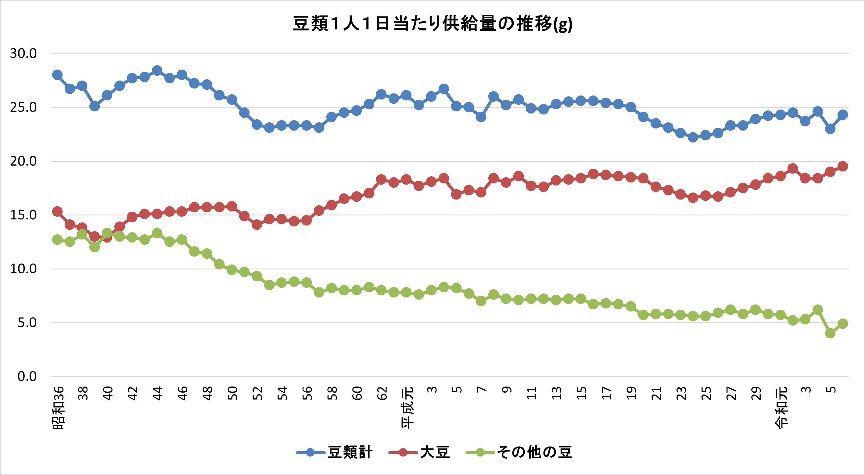雑豆類の1人1日当たり消費動向を供給量(乾燥豆換算)ベースでみると、昭和40年代中頃までは13グラム程度でしたが、その後は減少を続け、最近では5グラム程度とほぼ半減となりました。一方、大豆は、かつては雑豆とほぼ同程度でしたが、昭和50年代半ば頃から増加傾向となり平成16年には18.8グラムに達し、その後は少し減少して平成24年には16.6グラムになりました。しかしながら、最近では再び増加傾向となり、令和6年は19.5グラムとなっています。